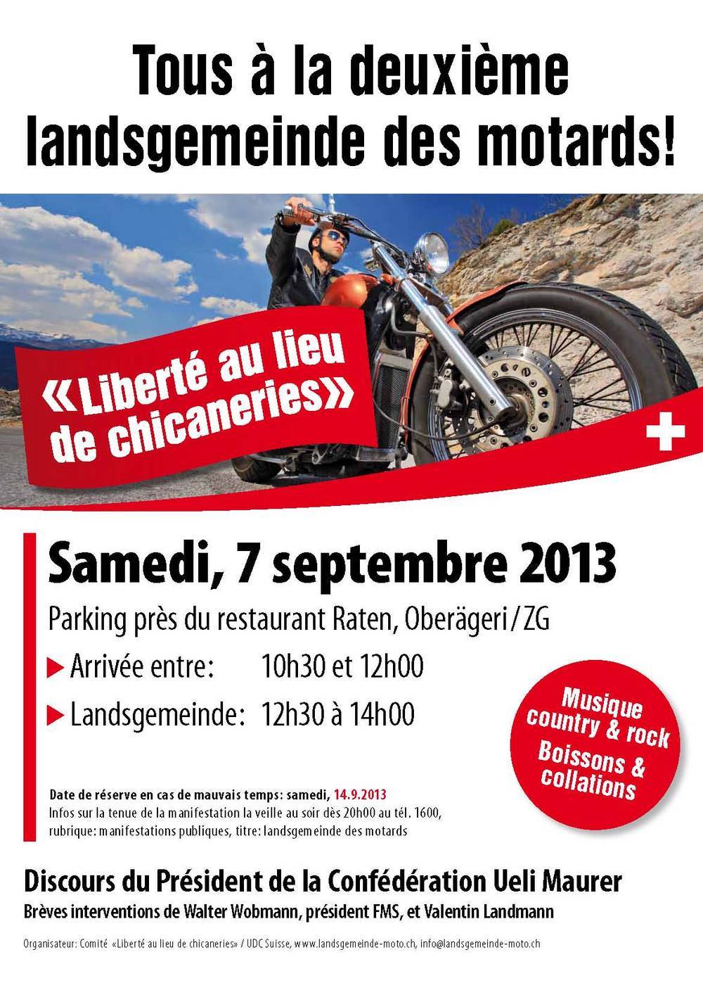 Infos sur la tenue de la manifestation la veille au soir dès 20h00 au tél. 1600, rubrique: manifestations publiques, titre: landsgemeinde des motards