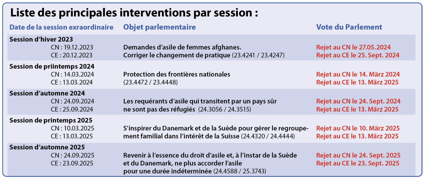 Rien que durant cette législature, l’UDC a imposé 5 sessions extraordinaires et déposé plus de 250 interventions contre le chaos de l’asile. Mais les autres partis et le conseiller fédéral socialiste Beat Jans bloquent nos propositions de solutions.