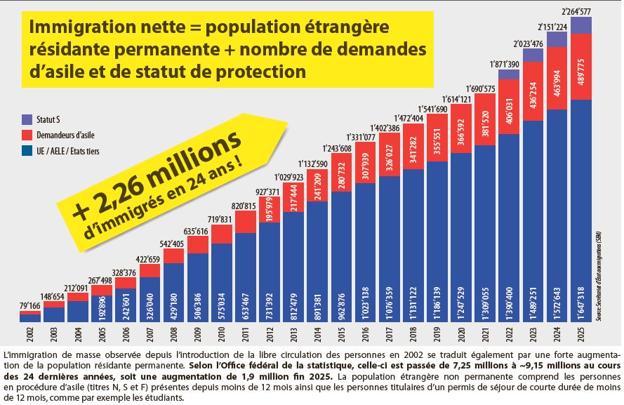 À la fin de l’année 2025, la Suisse comptera environ 9,1 millions d’habitants. La population résidante permanente aura augmenté d’un million de personnes en l’espace de 12 ans. Il faut freiner cette immigration effrénée.