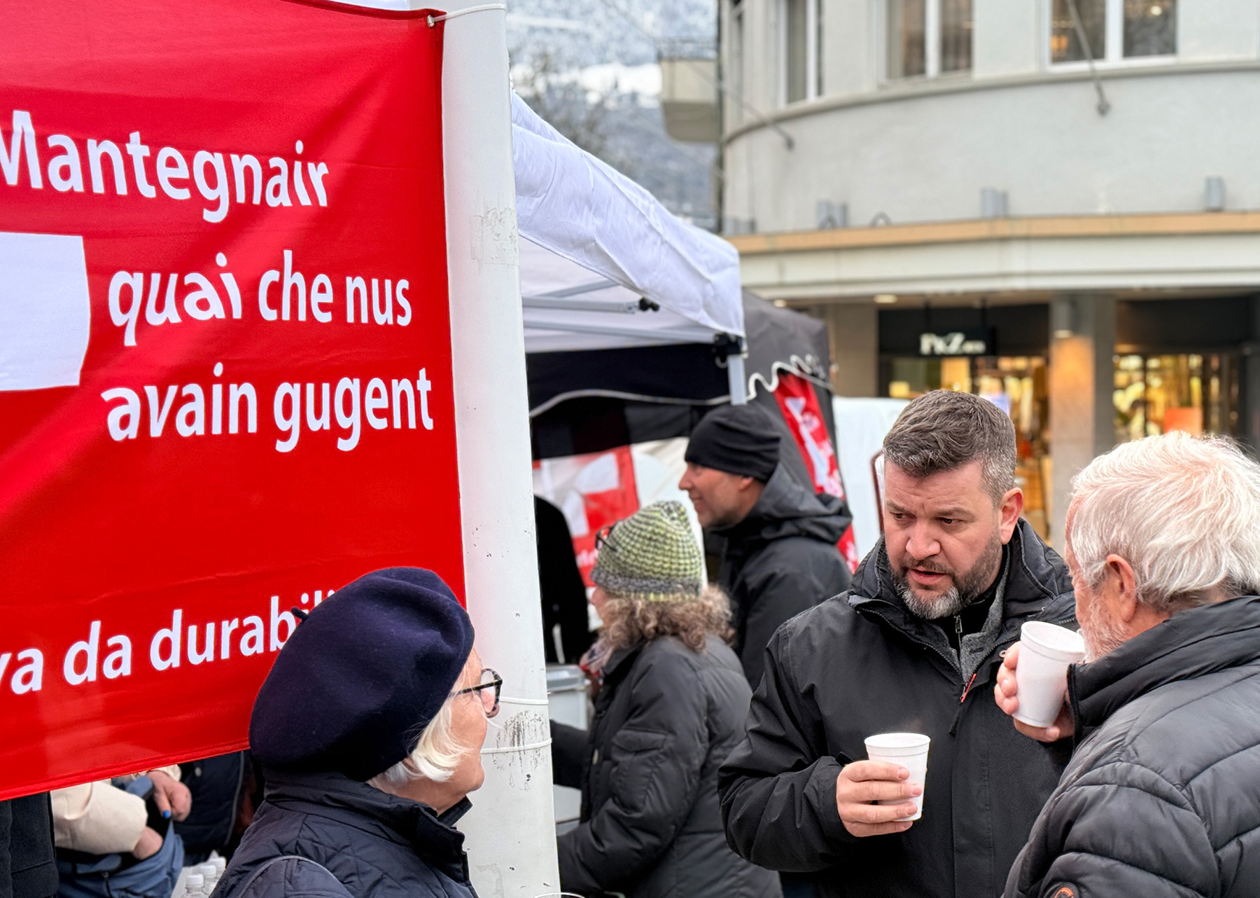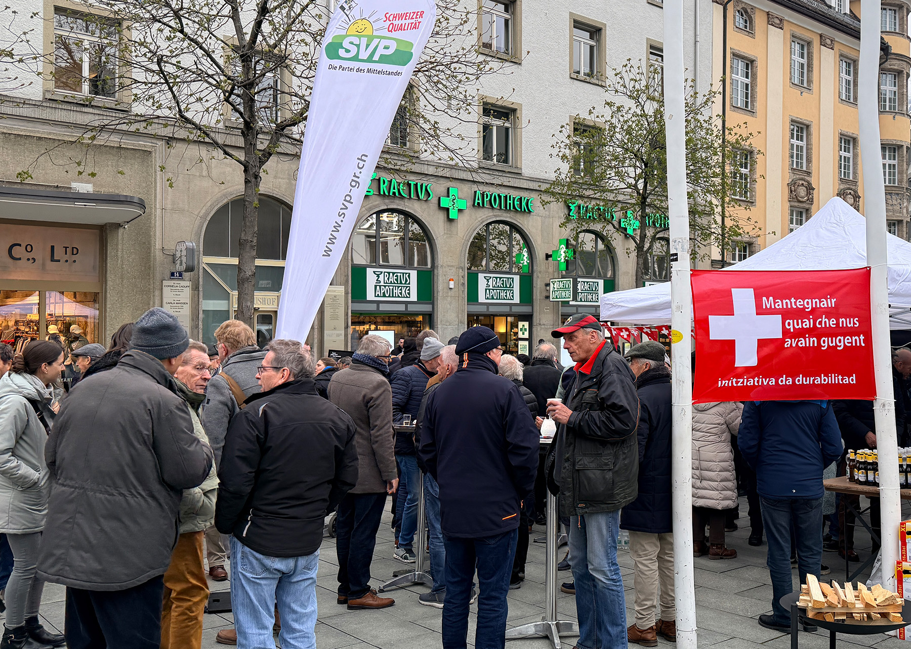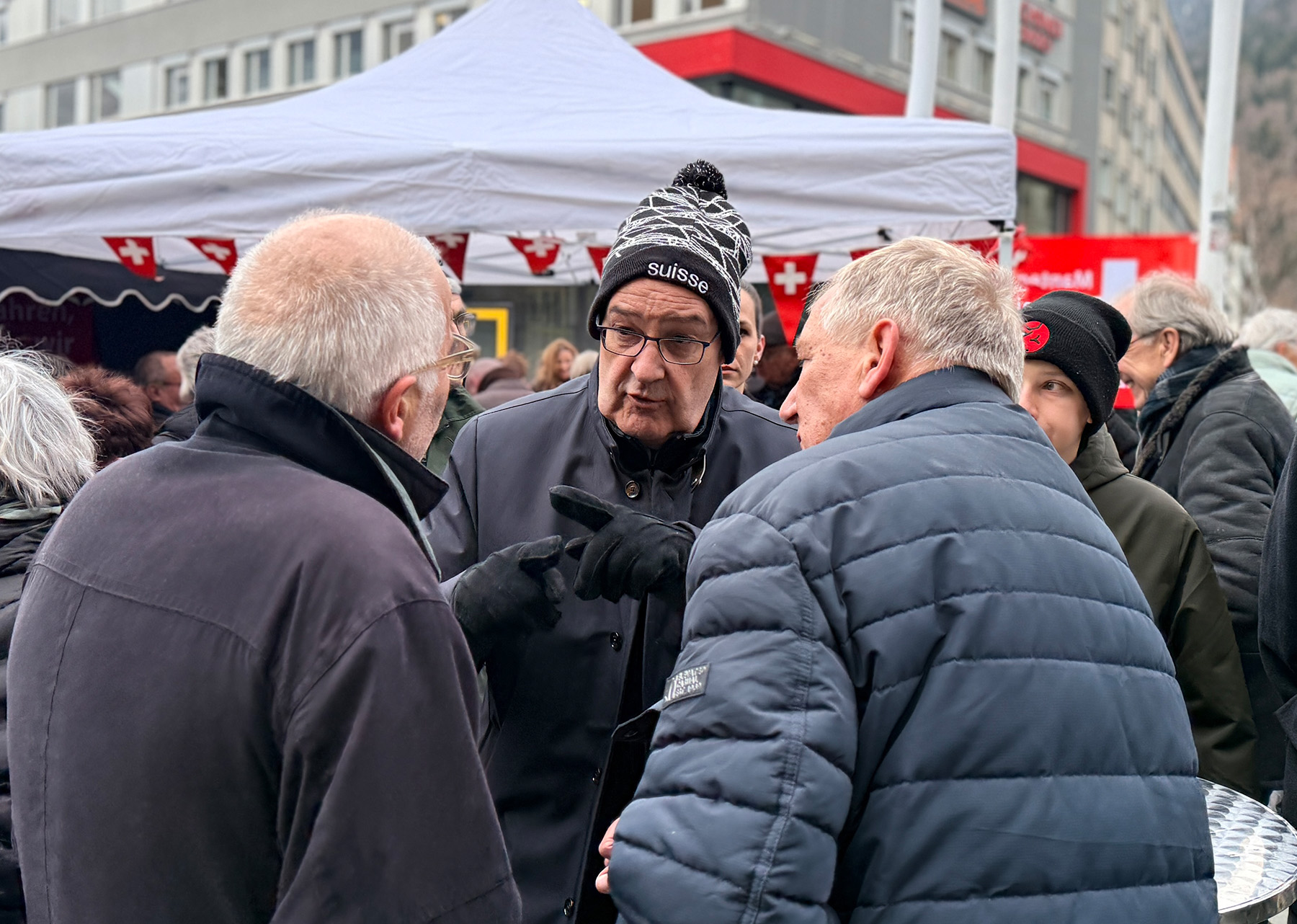 À l’issue de la séance, un « UDC proche de vous » a eu lieu à Coire. Sur l’Alexanderplatz, des élus de l’UDC se sont réunis pour un échange informel avec la population intéressée, parmi lesquels le conseiller fédéral Guy Parmelin. Divers représentants de l’UDC du canton des Grisons étaient également présents pour répondre aux questions, entre autres la vice-présidente Magdalena Martullo-Blocher, le conseiller national Roman Hug et la candidate au Conseil d’État Valérie Favre Accola.