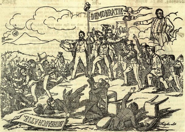 A la fin des années 1860, la plupart des cantons ont renouvelé leur constitution dans un sens plus démocratique. Il s’agissait notamment de lutter contre les excès de la bureaucratie, comme nous le voyons avec cette illustration. L’administration était déjà perçue à l’époque comme tentaculaire. L’extension des droits populaires devait immédiatement faire ses preuves, les craintes de la classe politique de voir la prétendue « plèbe » prendre de mauvaises décisions restaient infondées. Même Gottfried Keller, d’abord sceptique, dut admettre que le peuple percevait ses nouveaux droits avec beaucoup plus de sagesse, de dignité et de clairvoyance qu’il ne l’avait redouté.