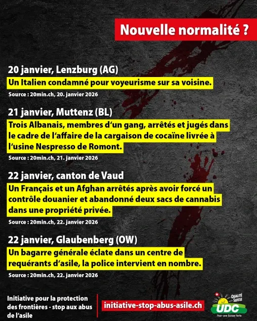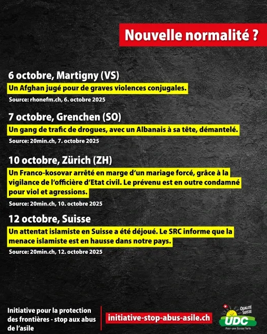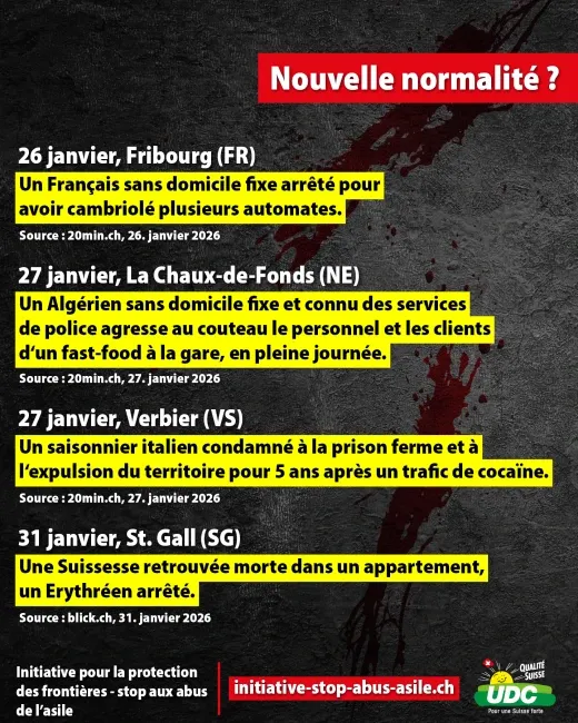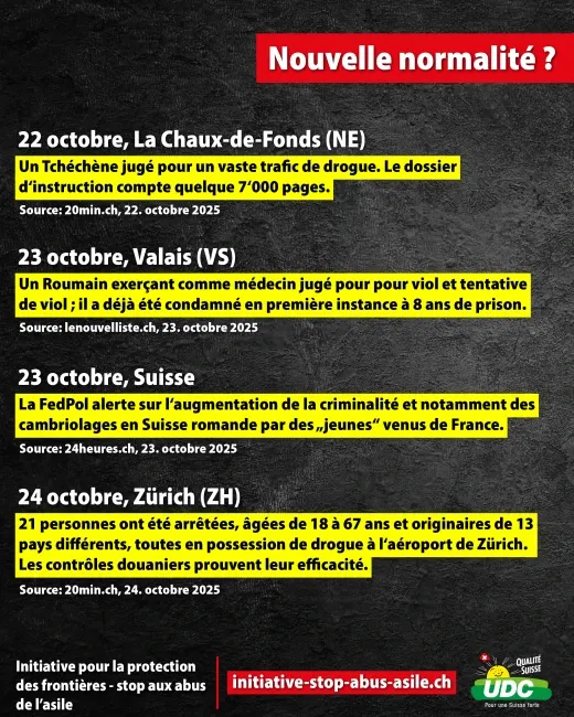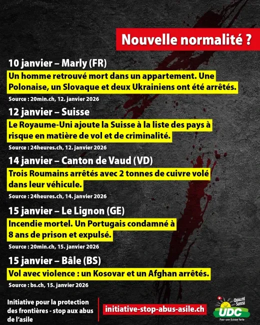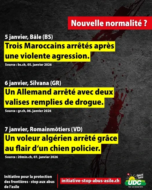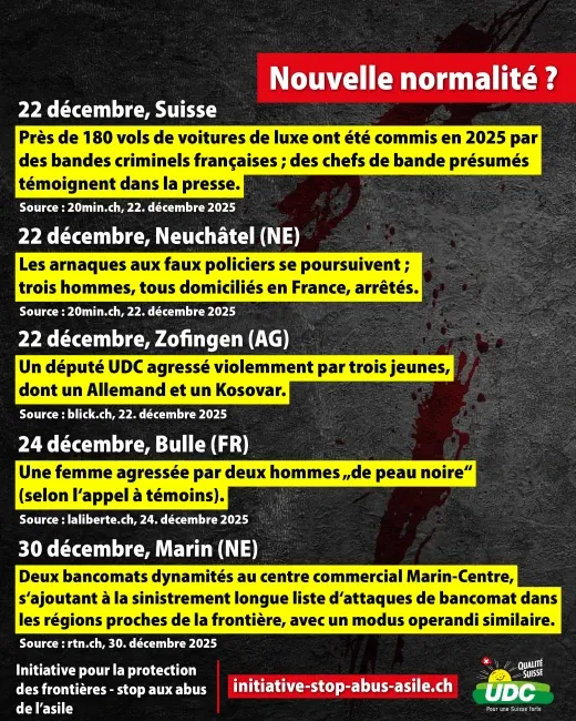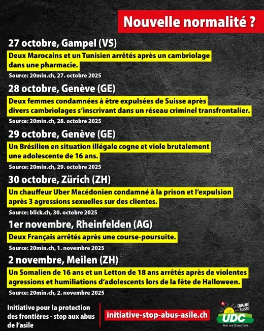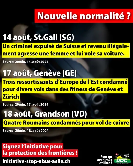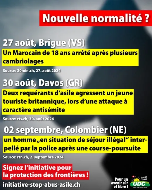 Les vols, les viols, les agressions au couteau et les cambriolages sont désormais monnaie courante. Des migrants demandeurs d'asile criminels commettent parfois des actes de violence très graves. Le chaos qui règne dans le domaine de l'asile met en danger la sécurité intérieure de la Suisse et coûte des milliards aux contribuables. Au lieu de contrôler les frontières, le conseiller fédéral socialiste Beat Jans refuse de prendre des mesures efficaces pour protéger sa propre population. Signez donc maintenant l'initiative populaire « Stop aux abus de l’asile ! » (initiative pour la protection des frontières) https://initiative-stop-abus-asile.ch/