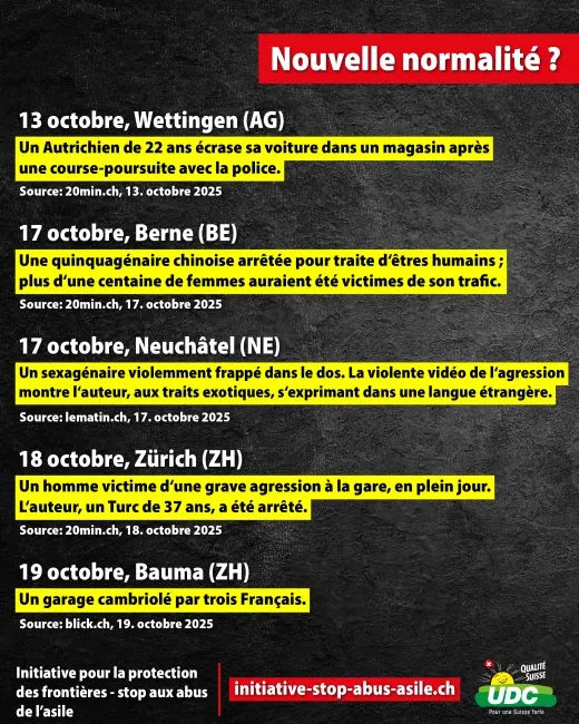 La Suisse est de moins en moins sûre, en raison de l'importation d'une criminalité qui profite du laxisme de la politique migratoire et des frontières passoires. L'UDC est le seul parti à s'engager réellement contre l'immigration de masse et pour la protection des frontières. https://initiative-stop-abus-asile.ch/