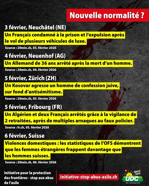 Viols, violences, vols… le quotidien de la Suisse est toujours plus sombre, en raison d'une immigration de masse incontrôlée qui importe avec elle son lots de criminels. L'UDC est le seul parti à se battre frontalement pour limiter l'immigration et protéger les frontières.