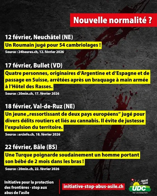 Les vols, les viols, les agressions au couteau et les cambriolages sont désormais monnaie courante. Des migrants demandeurs d'asile criminels commettent parfois des actes de violence très graves. Le chaos qui règne dans le domaine de l'asile met en danger la sécurité intérieure de la Suisse et coûte des milliards aux contribuables. Au lieu de contrôler les frontières, le conseiller fédéral socialiste Beat Jans refuse de prendre des mesures efficaces pour protéger sa propre population. Signez donc maintenant l'initiative populaire « Stop aux abus de l’asile ! » (initiative pour la protection des frontières) https://initiative-stop-abus-asile.ch/