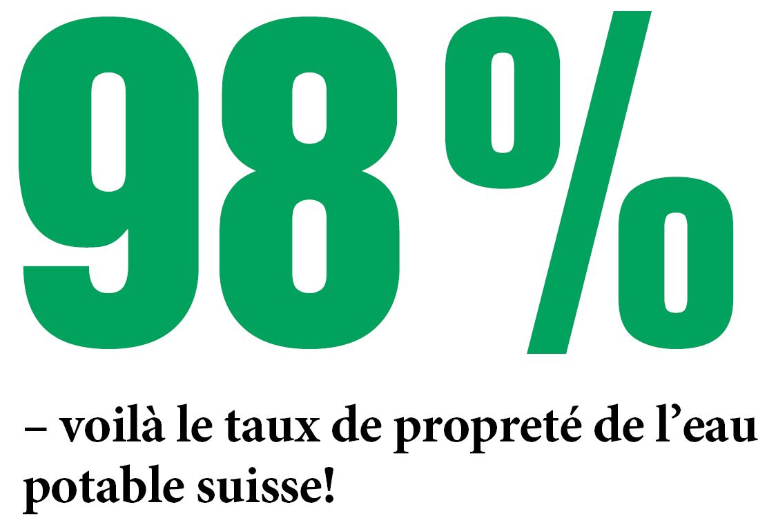 - la qualité de l’eau potable suisse est excellente. On peut boire l’eau du robinet sans aucun risque pour la santé. 98% des points de mesure des nappes phréatiques affichent des résultats qui respectent la valeur limite de 0,0000001 gramme par litre (!) et par substance-trace. Des plans d’action sont en préparation ou en cours pour réduire encore ces impuretés. Par exemple, 51 mesures sont prévues dans le domaine phytosanitaire.
