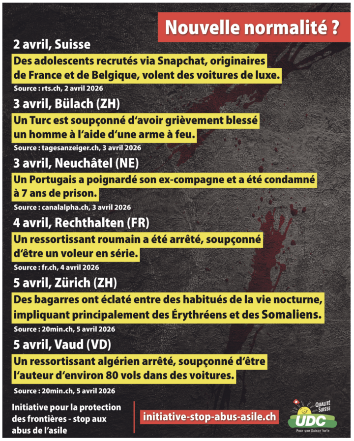Selon les statistiques, la criminalité a augmenté de 30 % en Suisse depuis 2019 ! Un délit sur quatre est le fait de demandeurs d’asile et clandestins ! Chaque année, nous comptons des milliers de victimes à cause de l’immigration massive de demandeurs d’asile.